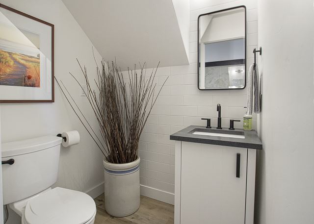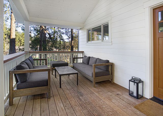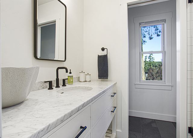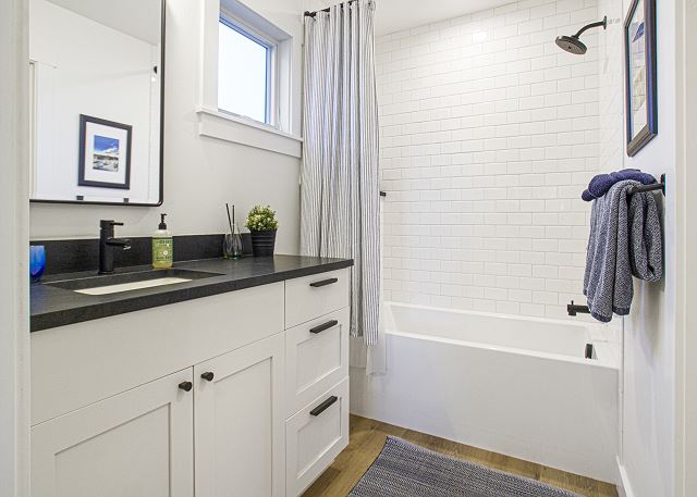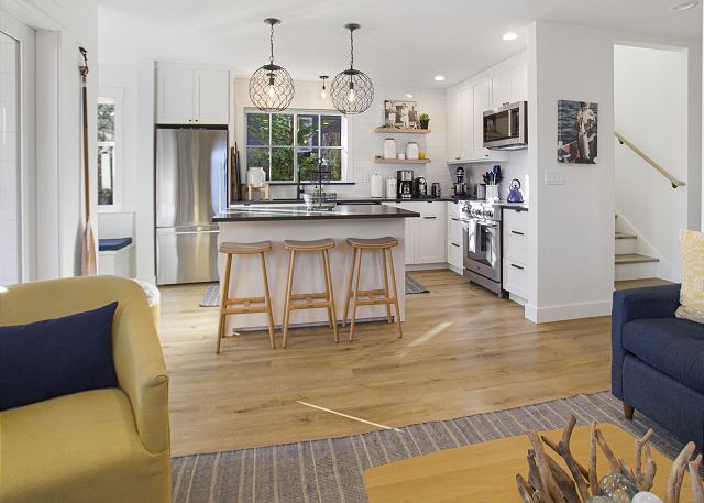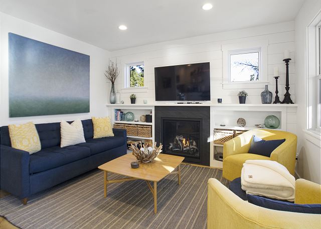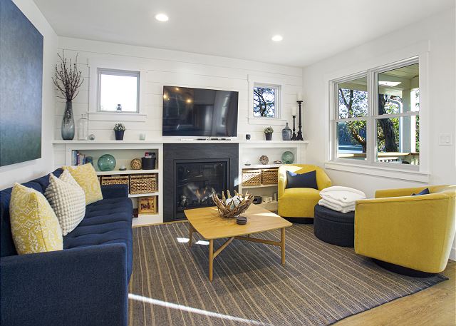 After a day outdoors, unwind by the cozy propane fireplace or refresh in spa-like bathrooms featuring luxurious rain showerheads. The fully equipped kitchen makes home-cooked meals a breeze, while modern furnishings and coastal touches throughout create a clean, stylish, and welcoming atmosphere.